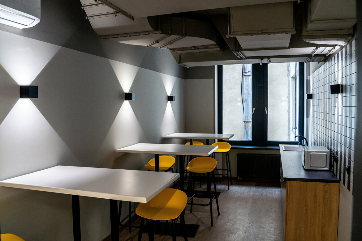 Рабочие заменили кровлю, инженерные сети, окна, двери, лифт, восстановили кирпичную кладку, установили системы пожаротушения, видеонаблюдения и охраны. Все помещения оснащены пропускной системой — войти можно по отпечатку пальца, QR-коду или Face ID.
