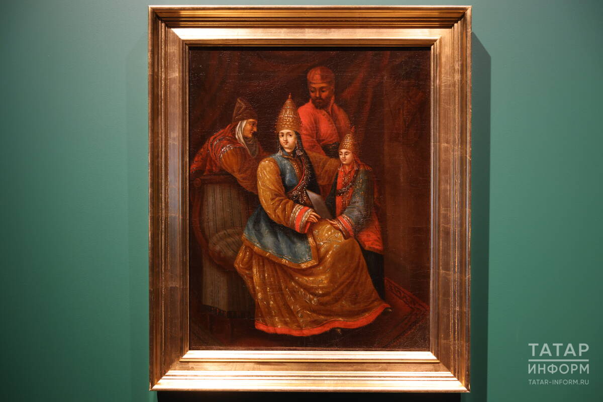 В одном из залов выставки сделан акцент на парсуне конца XVIII – начала XIX века. Это картина переходного жанра в Русском царстве – уже не икона, но еще и не портрет. На ней, как считается, изображена Сююмбике с сыном (а может, и дочерью) и еще двое мужчин, предположительно из родственного круга. Откуда эта парсуна у Юсуповых, достоверно неизвестно. Портрет Сююмбике, написанный спустя два века после ее жизни, – разумеется, допущение неизвестного автора.