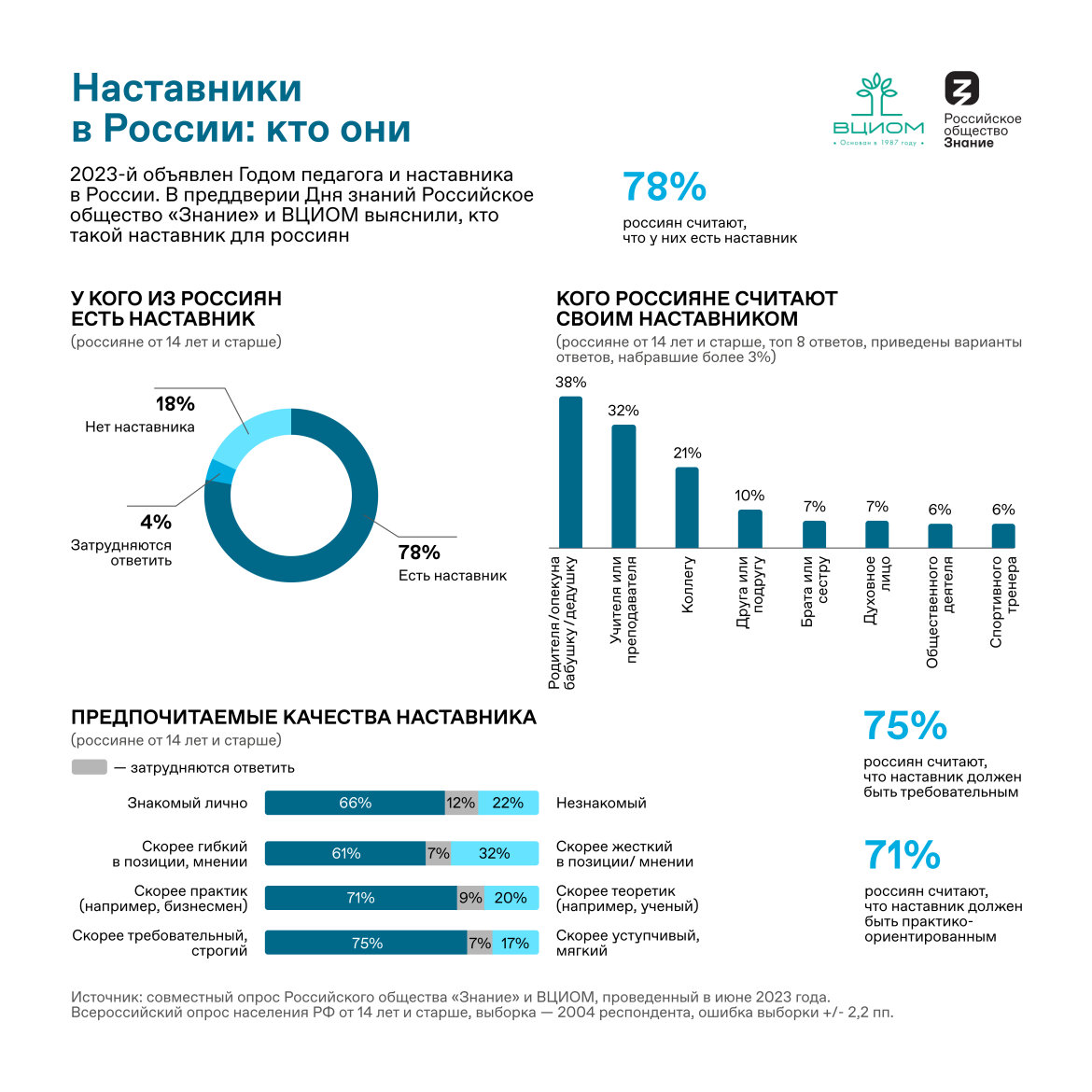 78% россиян 14 лет и старше считают, что в их жизни есть человек, которого можно назвать наставником. Чаще всего в качестве наставника называют ближайших родственников и педагогов. Такие данные следуют из совместного исследования Российского общества «Знание» и Всероссийского центра изучения общественного мнения (ВЦИОМ). Исследование проводилось в июне 2023 года.