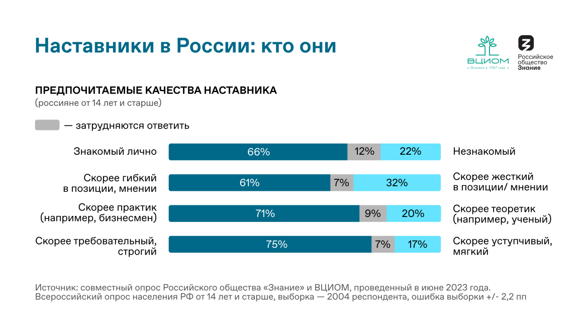 «Наше исследование показывает, что наставник для россиян сегодня – человек из ближайшего круга, гибкий, практико-ориентированный, с широко открытыми глазами на мир. С таким наставником можно говорить неформально, обсуждать сложности, узнавать ответы на волнующие вопросы, получая стимул для дальнейшего развития. Именно такие наставники востребованы сегодня», – рассказал генеральный директор ВЦИОМ Валерий Федоров.