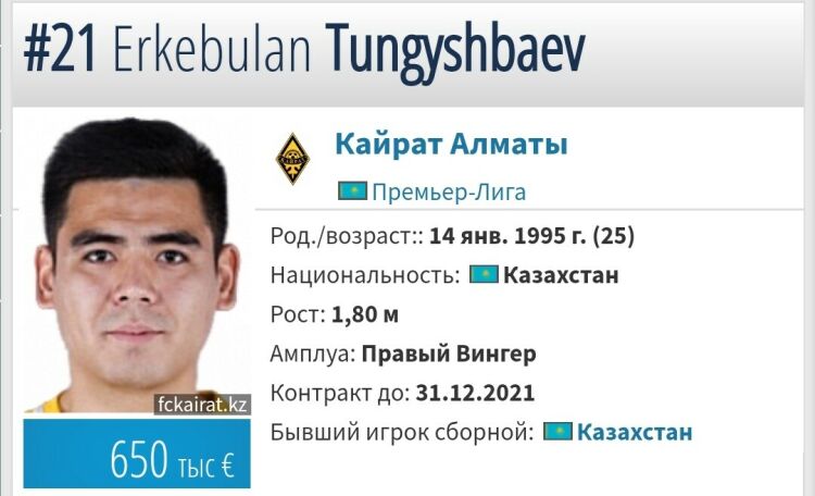 Издание сообщает, что сделка между клубами может быть официально оформлена уже на этой неделе. Нынешний контракт Тунгышбаева с «Кайратом» рассчитан до конца 2021 года. Ориентировочная трансферная стоимость 25-летнего футболиста оценивает в 650 тысяч евро.