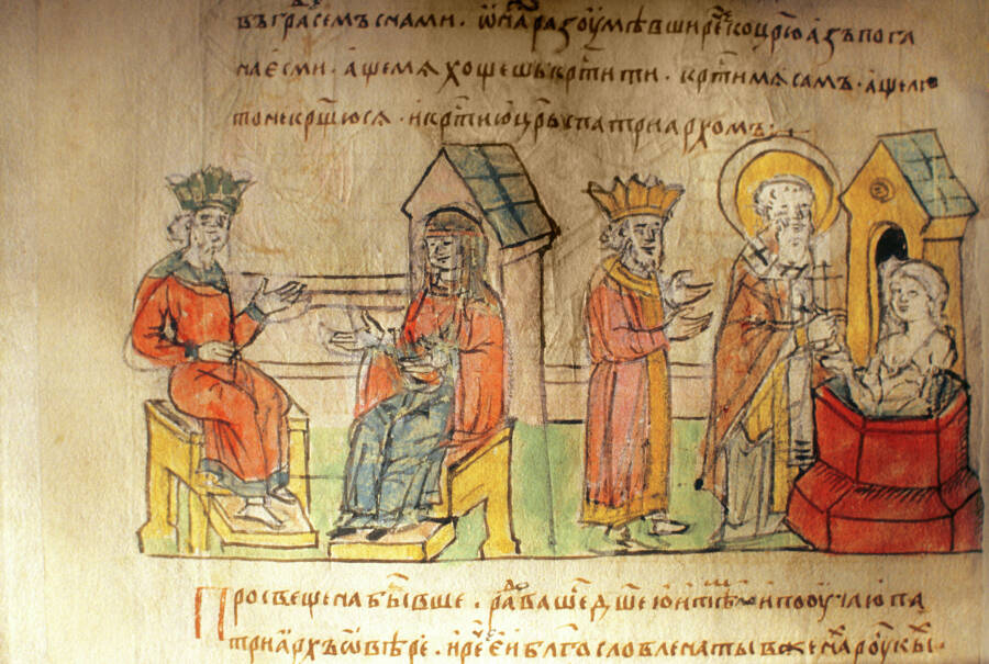 Радзивилловская летопись, XV век. Беседа княгини Ольги с византийским императором Константином VII Порфирогенетом – Багрянородным, и крещение ее византийским Патриархом