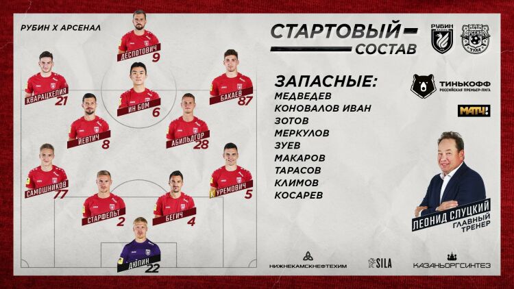 (Казань, 31 октября, «Татар-информ»). Стал известен стартовый состав «Рубина» в домашней игре 13-го тура РПЛ против тульского «Арсенала». С первых минут на поле выйдет Оливер Абильдгор, пропустивший игру против «Зенита» из-за дисквалификации. Денис Макаров, по этой же причине не игравший в Санкт-Петербурге, внесен в заявку на игру.