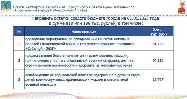 Помимо этого, почти 32 млн рублей городской бюджет потратил на мероприятия, связанные с празднованием 80-летия Победы в Великой Отечественной войне и татарским народным праздником «Сабантуй – 2025».