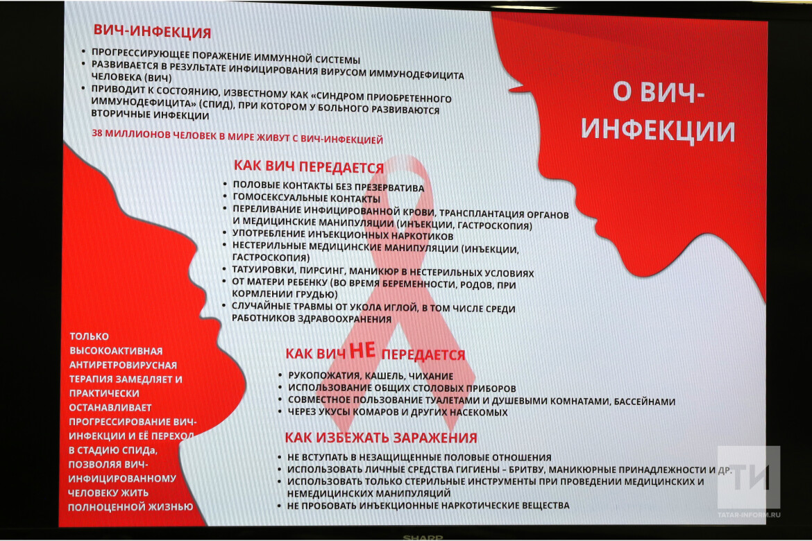 «У нас сегодня проживает более 14 тысяч людей с ВИЧ-инфекцией. К сожалению, мы ежегодно продолжаем выявлять новые случаи заражения, хотя есть тенденция к снижению», – отметил главный врач Республиканского центра по профилактике и борьбе со СПИД и инфекционными заболеваниями Минздрава РТ Нияз Галиуллин.