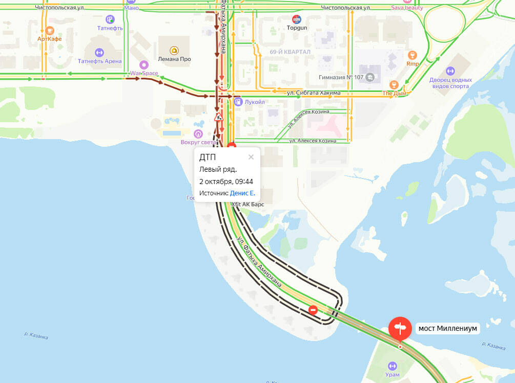На Фатыха Амирхана в сторону моста Миллениум в Казани прозошло ДТП. В результате на данном участке дороги образовалась пробка. Об этом следует из данных «Яндекс. Карты».