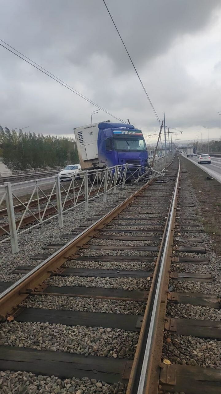 Грузовик снес ограждение и сбил опору контактной сети. В результате было временно приостановлено движение трамваев №5, 5а и 7.