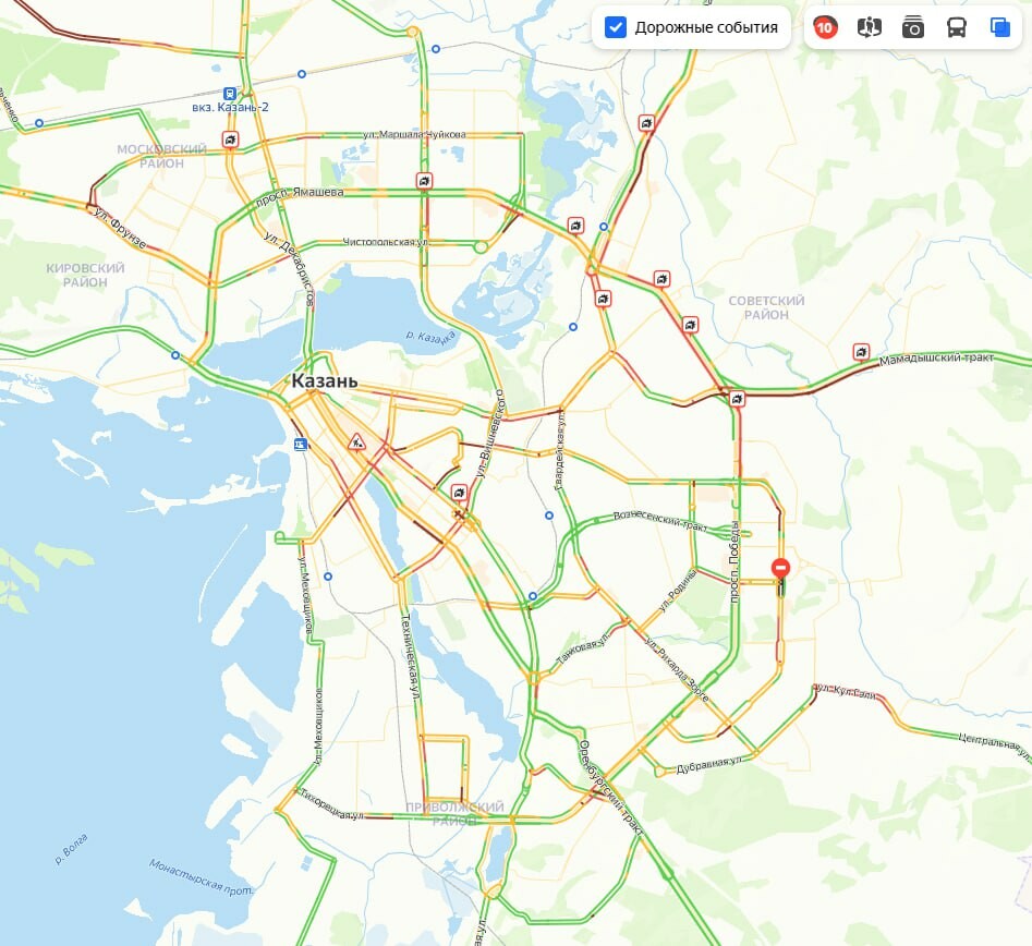 Из-за непогоды Казань вновь встала в 10-балльных пробках. Соответствующие данные отображаются в сервисе Яндекс.Пробки.