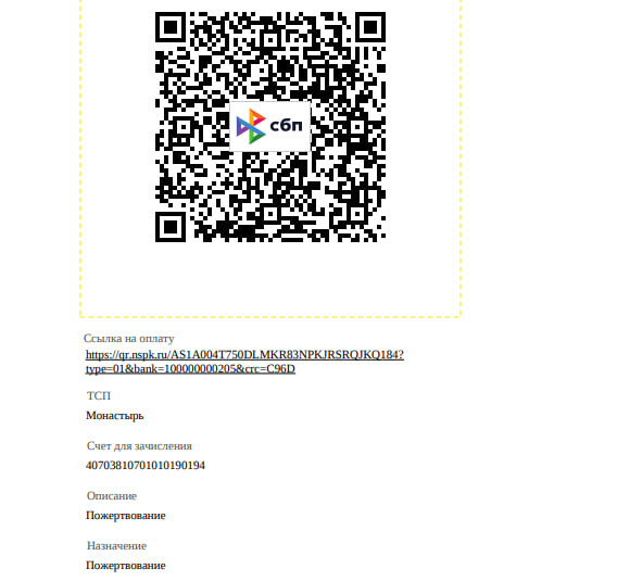 Представители монастыря просят оказать техническую, финансовую (поскольку стоимость снегоуборочных услуг чрезвычайно высока) или иную поддержку в сложившейся ситуации. Для оказания финансовой поддержки следует воспользоваться QR-кодом.