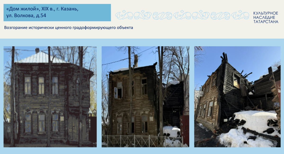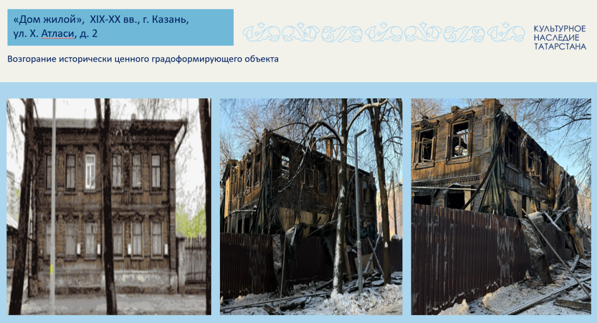 Кроме того, в ведомстве обратили внимание на ситуацию вокруг домов №54 по улице Волкова и №2 по улице Хади Атласи. Из-за пожаров на этих объектах Комитет РТ по охране ОКН направил заявления в МВД по Татарстану. Органы полиции приняли решения об отказе в возбуждении уголовных дел.