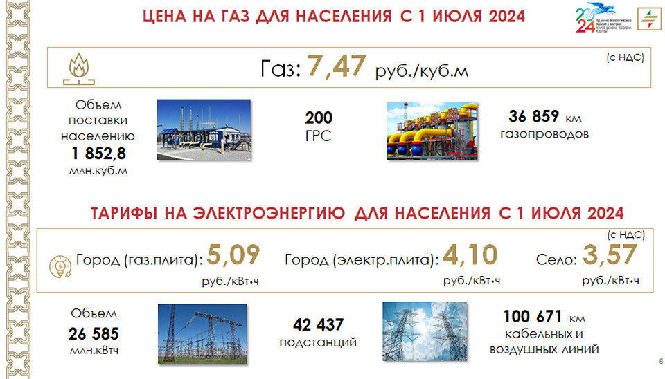 После индексации тариф на газ составит 7,47 рубля за кубический метр. Тарифы на электроэнергию составят 5,09 руб./кВт⋅ч (с НДС) для города и 3,57 руб./кВт⋅ч – для села. Одноставочный тариф для городских населенных пунктов в домах, оборудованных электроплитами, составит 4,1 рубля за кВт⋅ч (с НДС).
