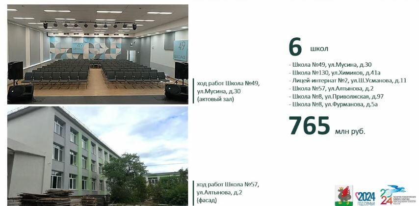 В образовательных учреждениях меняют инженерные сети, ремонтируют фасады, входные группы, кабинеты химии, физики, технологии, информатики, а также обновляют оборудование, мебель и инвентарь.