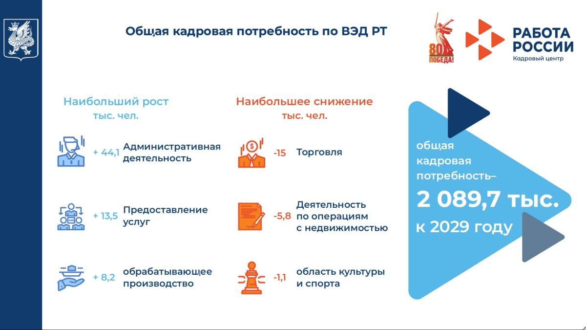 Всего же к 2029 году общая кадровая потребность в республике по прогнозам составит почти 2,9 млн человек. Сейчас этот показатель равен 2,4 млн.