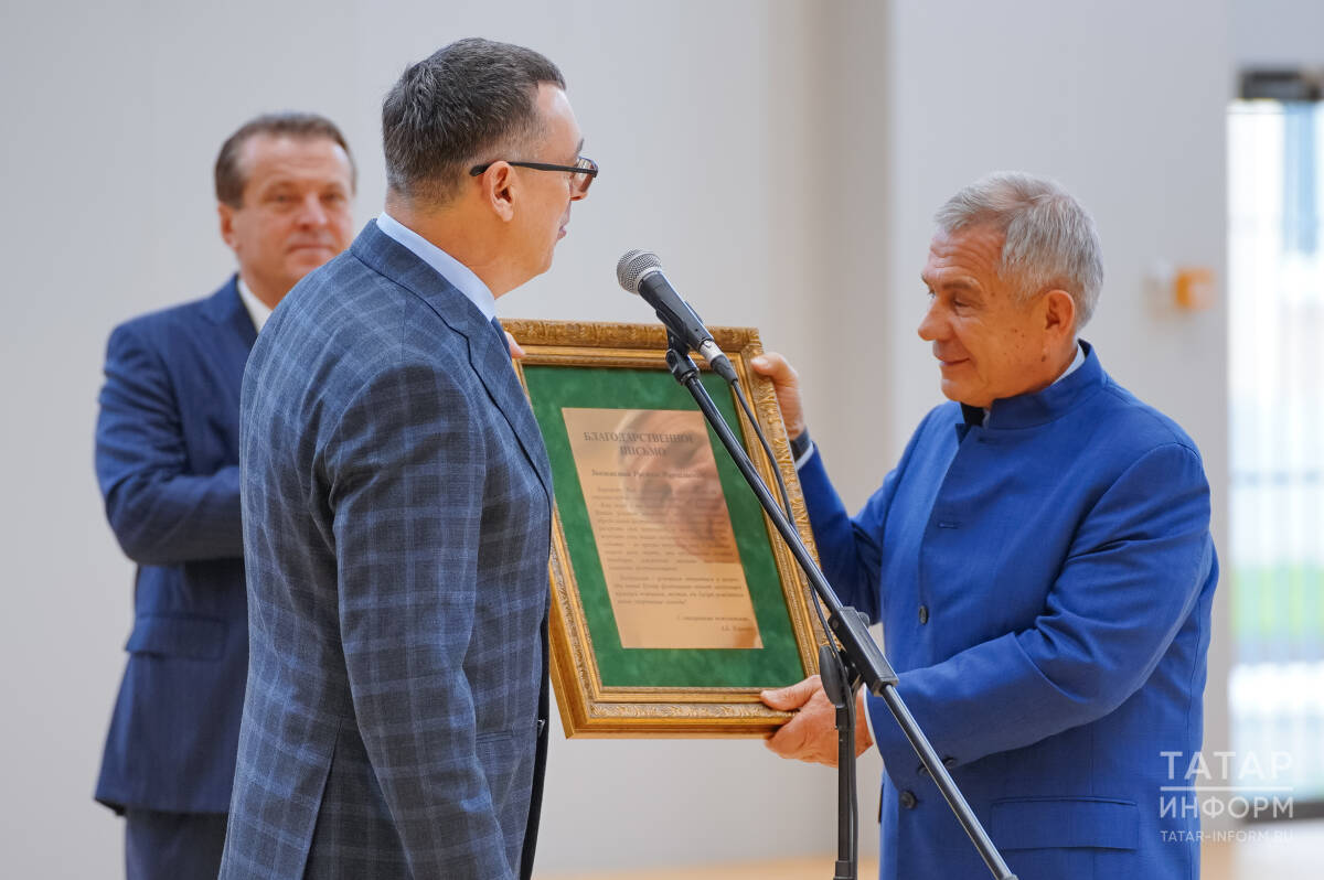 «В 76-м году после победы на Олимпийских играх, когда вернулись Наиля Гилязова, Валентина Никонова, Ольга Князева, здесь решили построить школу фехтования. После победы Марты Мартьяновой на Олимпиаде в Токио-2020, которая проходила в 2021 году, построили такой прекрасный Центр фехтования. Я не понимаю, как в такие короткие сроки вы смогли это сделать. Большая благодарность от Федерации России по фехтованию, от Алишера Бурхановича Усманова (российский миллиардер, один из спонсоров проекта, – прим. Т-и), всем, кто принимал участие в строительстве нового центра. Рустам Нургалиевич, вы развиваете спорт в Татарстане, без вас ничего бы не было. Спасибо вам большое», – сказал Мамедов и вручил Рустаму Минниханову памятную плакетку.