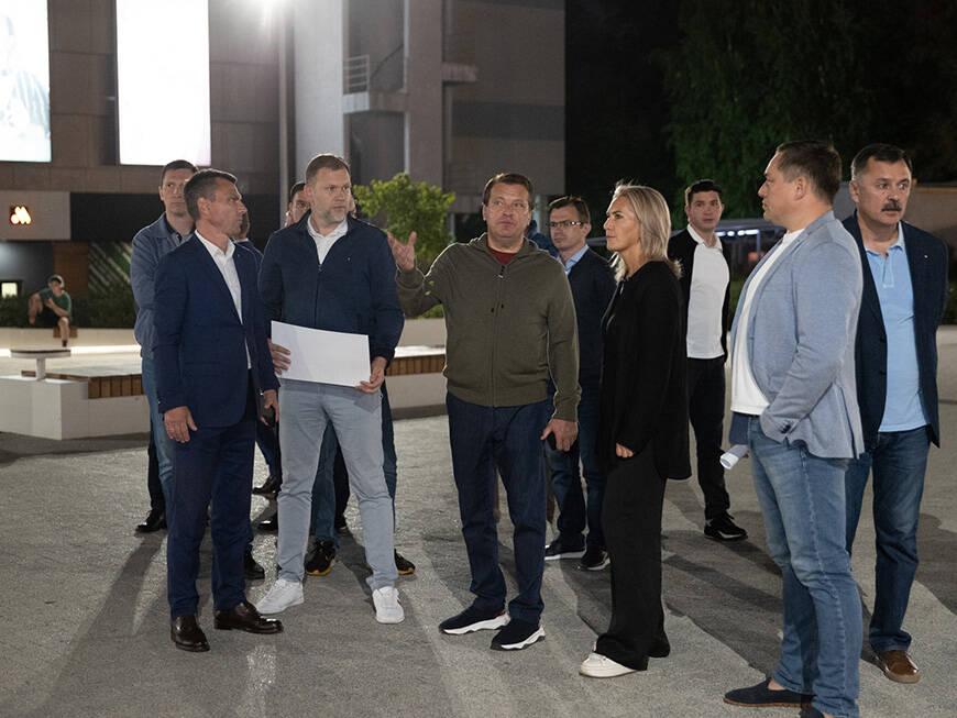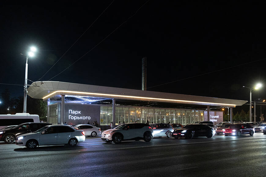 Участники совещания ознакомились с подсветкой остановочного павильона возле парка имени Горького. Сейчас его фасад украшен светодиодной лентой, а на кровле установлены 22 светильника, которые подсвечивают металлические пластины, визуально акцентируя остановку.
