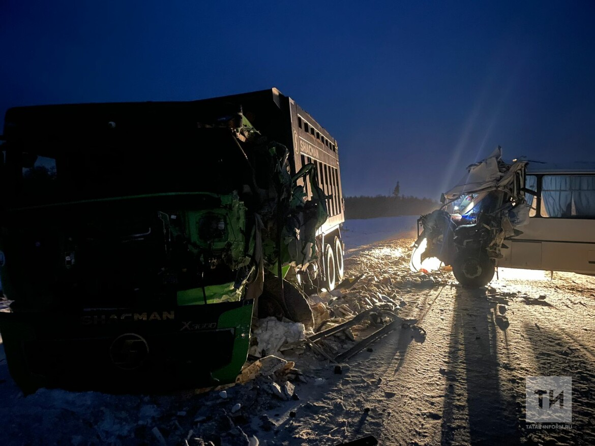 Кабина автобуса смялась после ДТП с грузовиком в Татарстане, пострадали оба водителя
