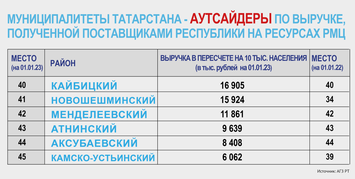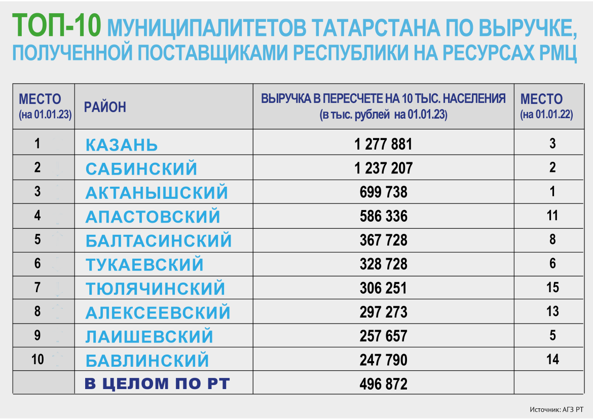 Ежемесячное ранжирование районов Татарстана в АГЗ РТ делают, переводя абсолютные показатели в относительные, то есть пересчитывая объемы выручки на 10 тыс. населения. Такой подход позволяет более объективно сравнивать несопоставимое – ту же Казань со всеми остальными 44 муниципалитетами республики.