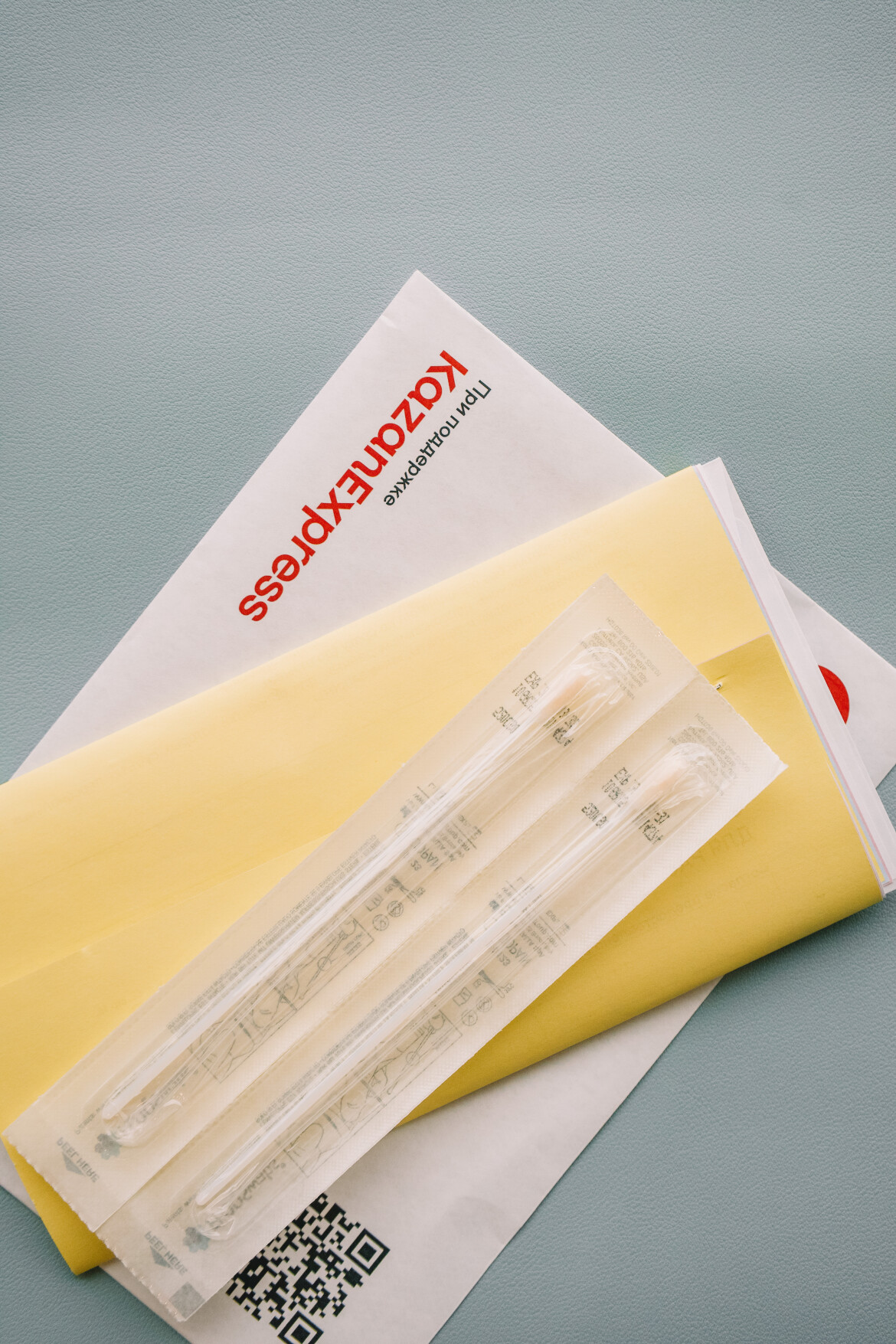 Конверт доставят до любого удобного пункта выдачи за один день. Дальше по приложенной инструкции можно собрать биоматериал с внутренней стороны щеки прямо в примерочной пункта выдачи. Вся процедура займет около пяти минут. После нужно заполнить анкету и отдать образец администратору пункта выдачи. Затем наборы доставят в Приволжский РДКМ.