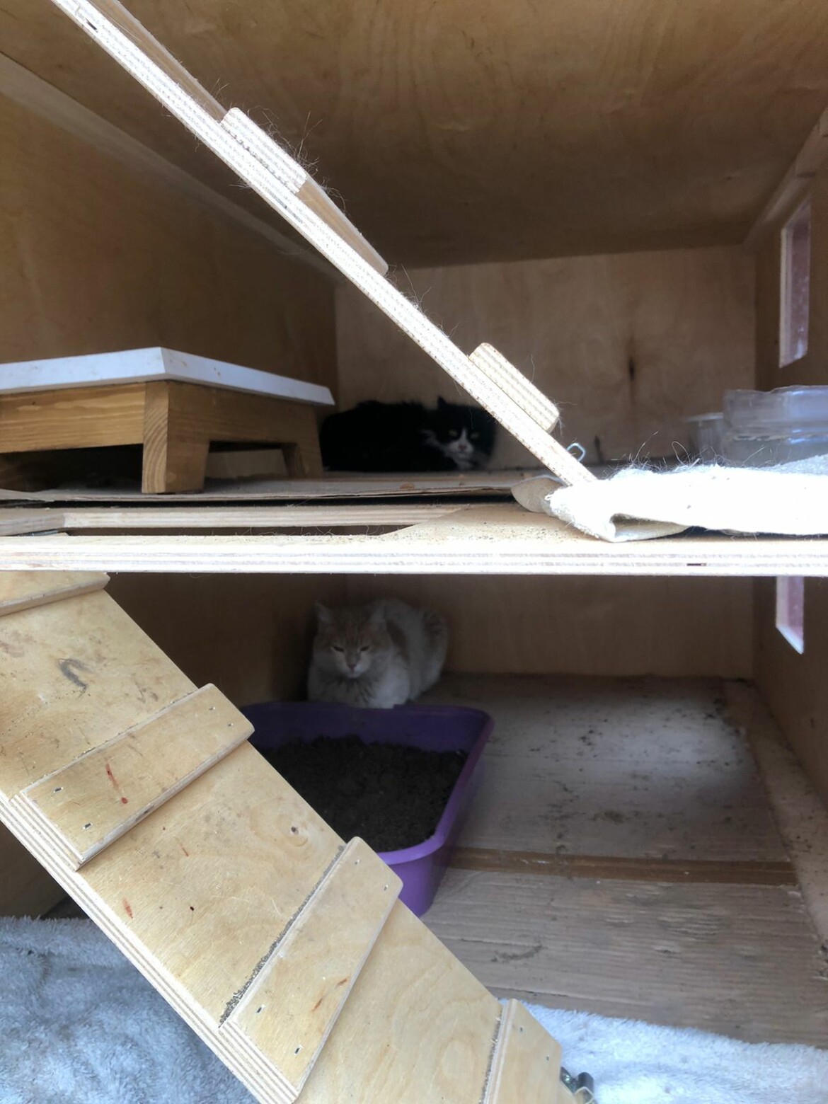 Кроме шести постоянных кошек, в домик прибегают и дворовые обитатели. Здесь они получают еду и воду.