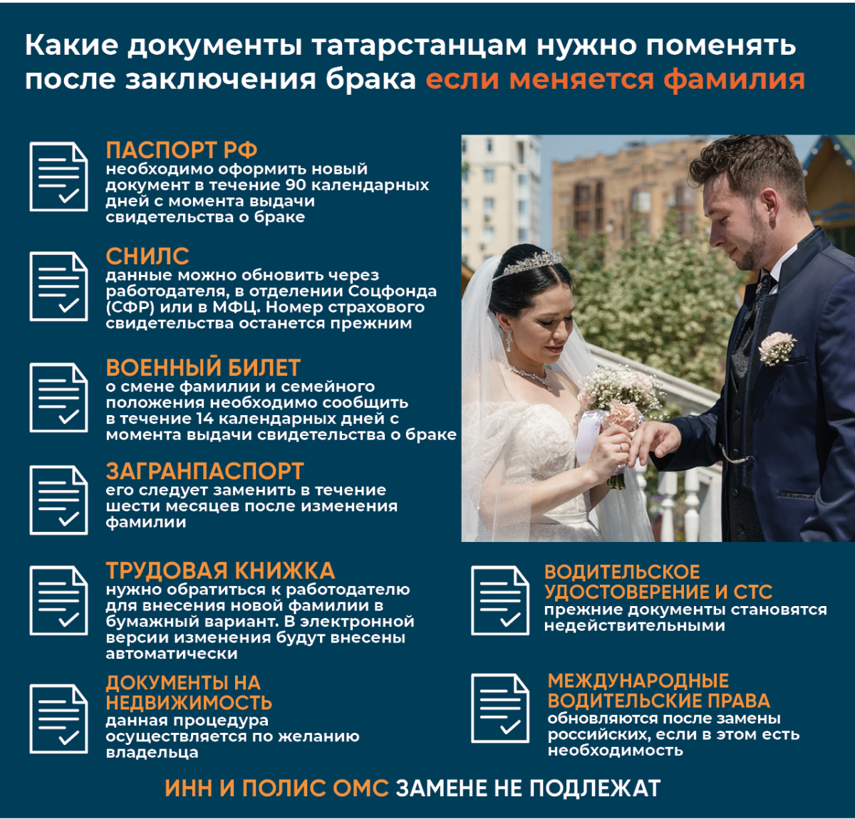Если после регистрации брака у одного из супругов меняется фамилия, необходимо обновить документы. О том, какие документы нужно поменять в обязательном порядке – в материале «Татар-информа».