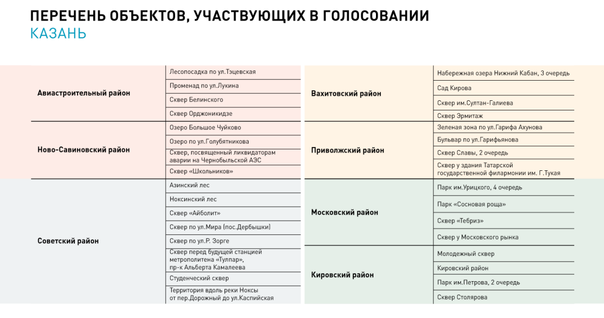 Итого восемь объектов в Советском районе Казани и по четыре объекта в остальных районах города.