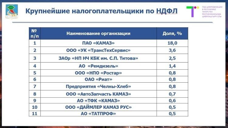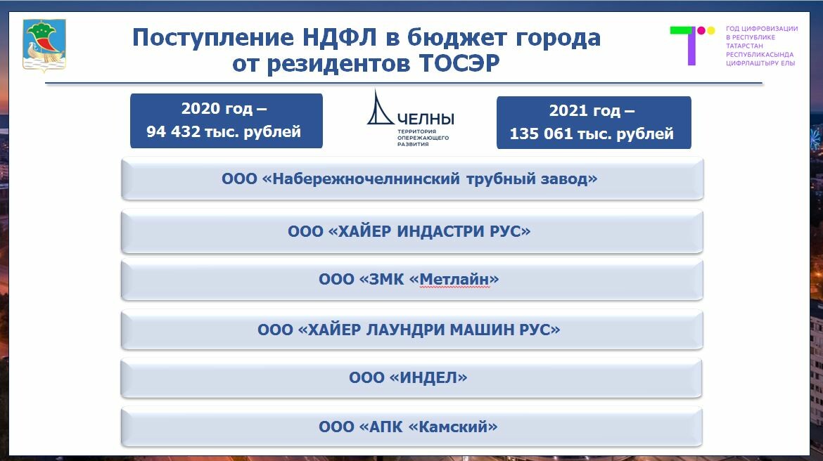 В список предприятий ТОСЭР, обеспечивших наибольшее поступление НДФЛ в бюджет города, входят «Набережночелнинский трубный завод», «Хайер индастри рус», завод металлоконструкций «Метлайн», «Хайер лаундри машин рус», «Индел» и АПК «Камский».