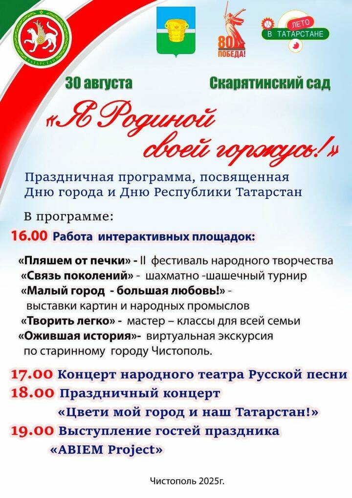 Также в День Татарстана и День города в Скарятинском саду пройдет праздничная программа «Я Родиной своей горжусь!». Для гостей подготовят мастер-классы, выставки, спортивные и творческие активности. На главной сцене выступят местные артисты, а завершит день этно-экспериментальный проект ABIEM Project.