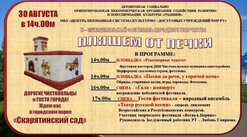 Также в День республики в Чистополе на территории исторического парка «Скарятинский сад» пройдет гала-концерт II муниципального фестиваля народного творчества «Пляшем от печки». Он длился три месяца и познакомил жителей района с работами местных мастеров, ремеслами и народными традициями.