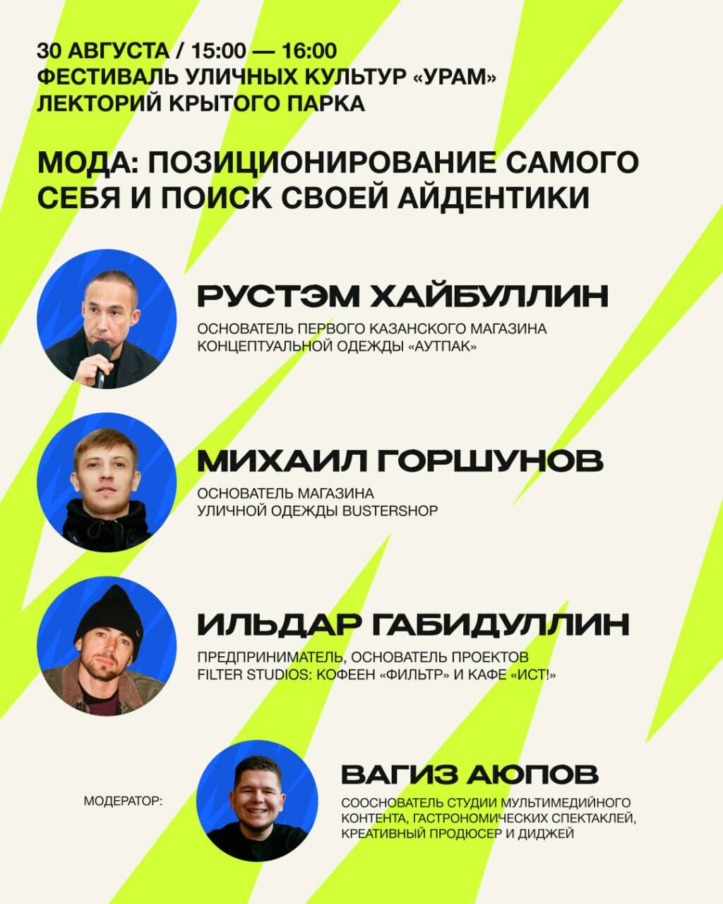Впервые на фестивале пройдет образовательный лекторий с приглашенными спикерами. Севада Восканян расскажет о том, как молодое поколение формирует новые культурные коды, а Дмитрий Ковязин обсудит современные тенденции электронной музыки. Еще одна дискуссия будет посвящена моде и самовыражению – модератором лектория выступит Вагиз Аюпов.