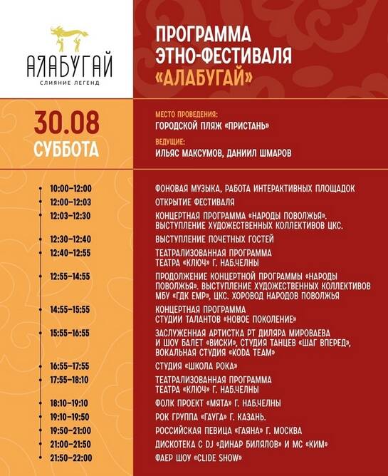 30 августа на пляже «Пристань» в Елабуге пройдет первый этнический фестиваль «Алабугай: Слияние легенд». С 10:00 до 22:00 гости смогут познакомиться с культурным наследием региона, открыть для себя местные легенды и традиции.