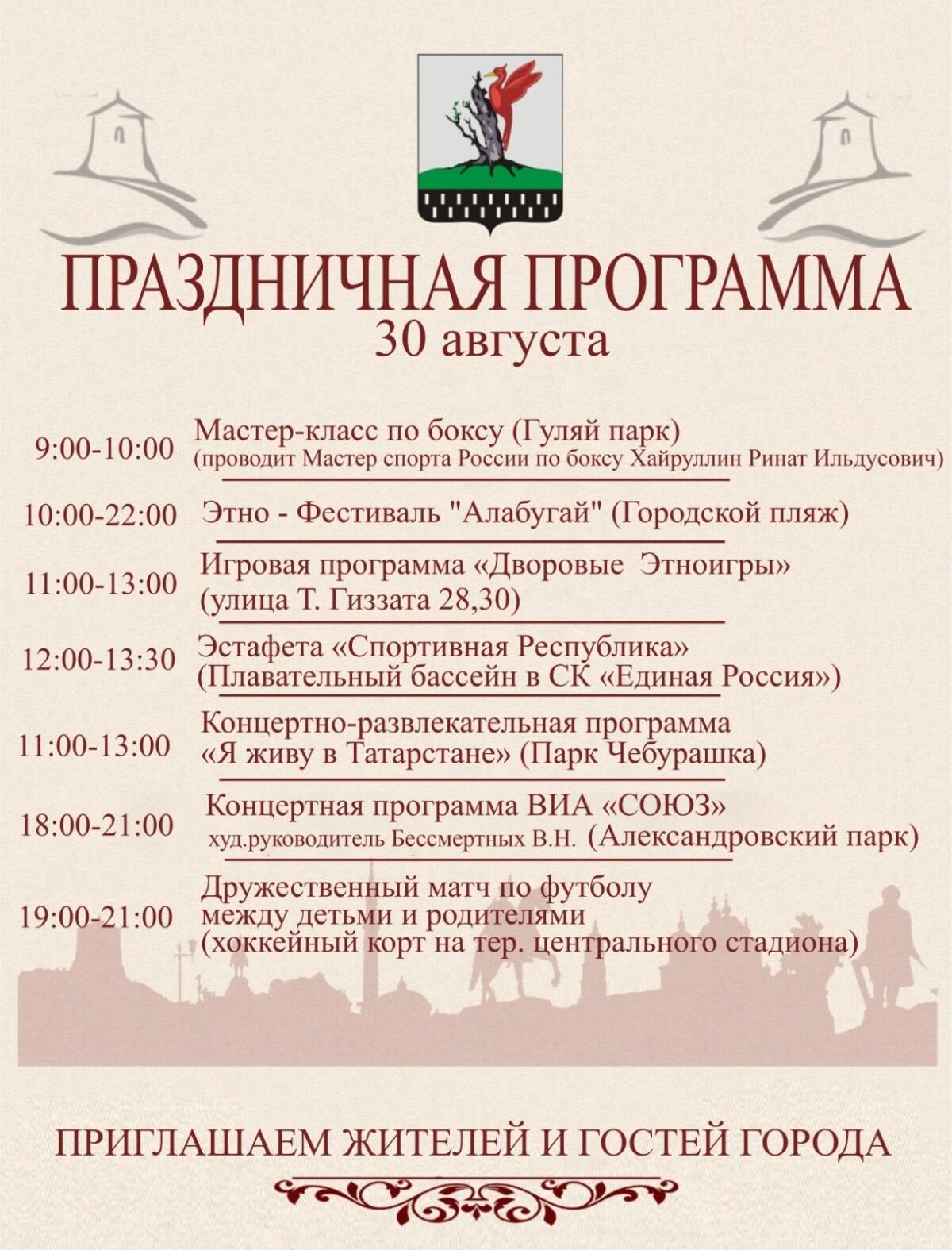 30 августа в Елабуге объединятся сразу три праздника – День Республики Татарстан, День города и День нефтяников. Помимо этнического фестиваля «Алабугай» гостей ждут мастер-классы по боксу, игровые «Дворовые этноигры», эстафета «Спортивная республика», концерт «Я живу в Татарстане», вечерний концерт ВИА «СОЮЗ» и дружеский матч по футболу между детьми и родителями.