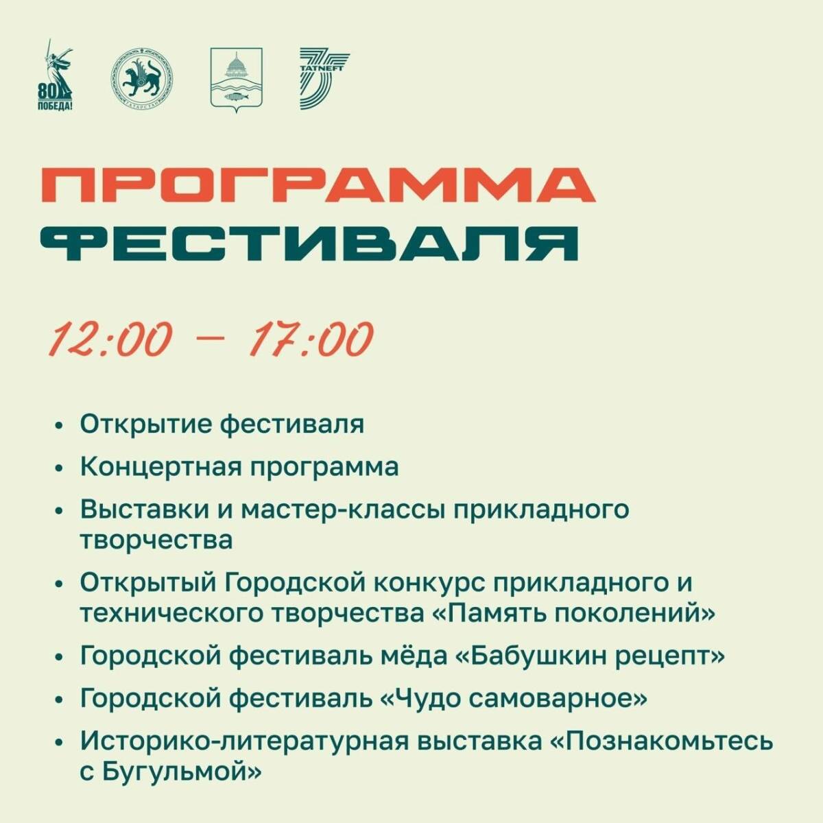 В этот день пройдет V Межрегиональный фестиваль традиционных ремесел «Бугульма ремесленная». Мастера из Татарстана, Башкортостана, Удмуртии, Самарской и Оренбургской областей представят изделия ручной работы и поделятся национальными традициями. Фестиваль проводится с 2019 года и стал для жителей города доброй традицией.