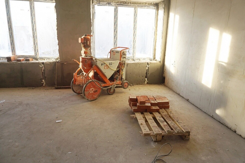 На площадке трудятся 70 рабочих. Специалисты занимаются прокладкой электрических сетей, систем вентиляции, водоснабжения, канализации и отопления. На этажах меняют окна, выравнивают полы, завершают штукатурку стен.