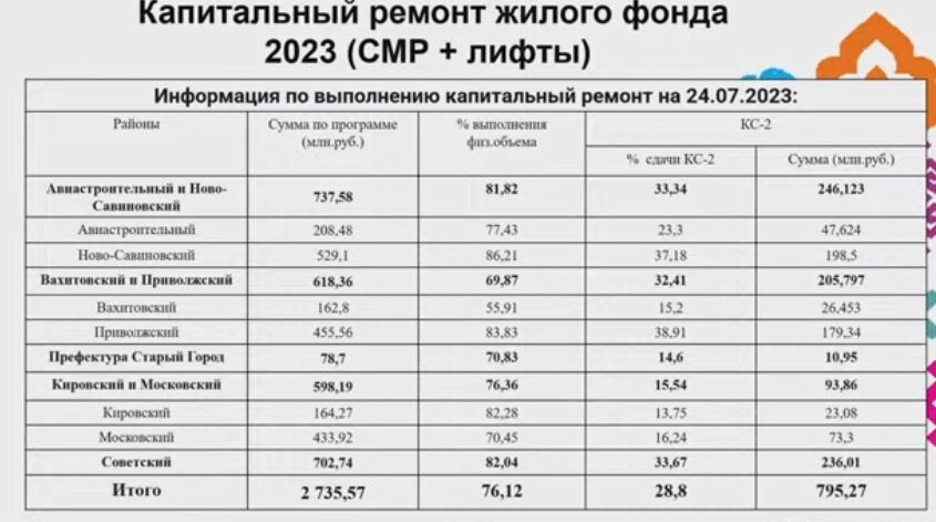 В Казани работы по программе капитального ремонта многоквартирных домов выполнены на 76%. На 28,8% работ уже оформлены акты о приемке. Об этом на деловом понедельнике в мэрии сообщил председатель городского Комитета жилищно-коммунального хозяйства Василий Лысачкин.