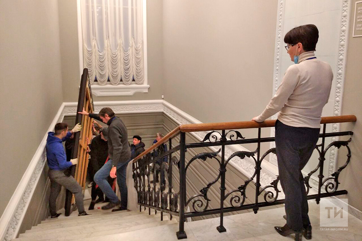 Внутри здания Музея ИЗО РТ встал вопрос, как заносить картину на второй этаж. Задача эта оказалась не менее сложной, чем перенос из грузовика в здание