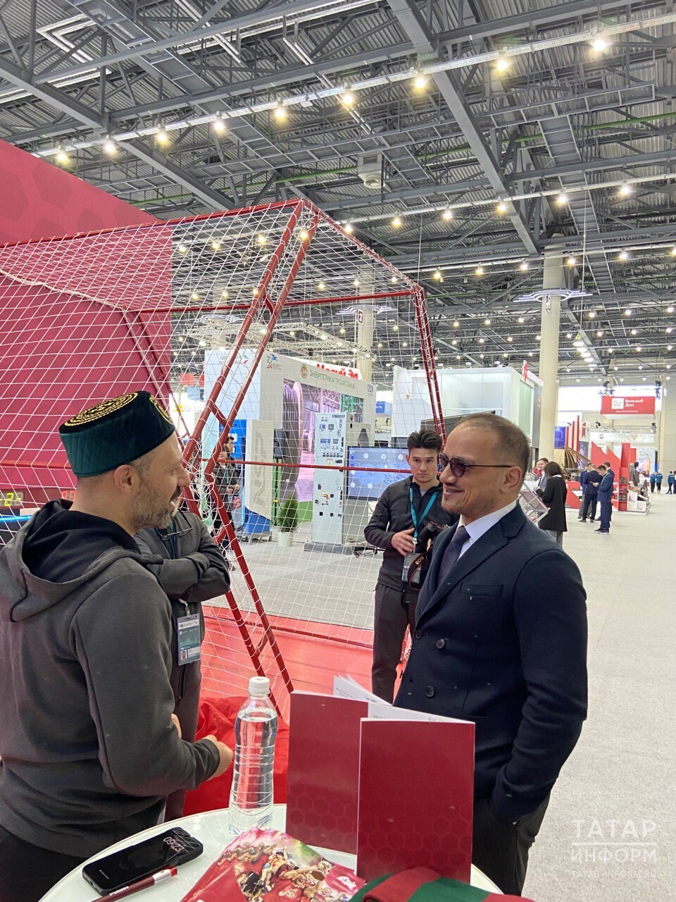Гость в татарском национальном головном уборе – в тюбетейке – побывал на стенде казанского футбольного клуба в «Казань Экспо», где охотно фотографировался с посетителями международного события. В частности, он пообщался с соотечественником – с представителем «Анадолу» Огузом Каракашем – и сделал с ним снимок на память.
