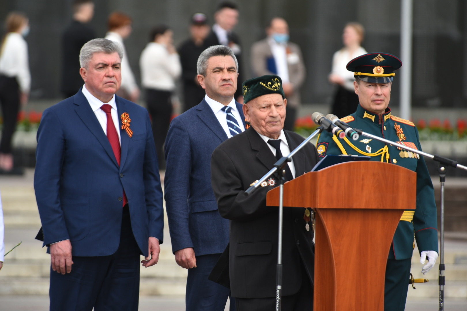 От имени ветеранов войны выступил фронтовик, кавалер ордена Отечественной войны II степени, обладатель медалей «За отвагу», «За победу над Германией» и «За освобождение Венгрии», участник Парада Победы на Красной площади Мифтах Ансапович Нуртдинов. Он рассказал, как 17-летним мальчиком пошел на фронт в 1943 году, как воевал в Беларуси и на Украине, прошагал половину Европы и получил свою первую награду в День Победы.