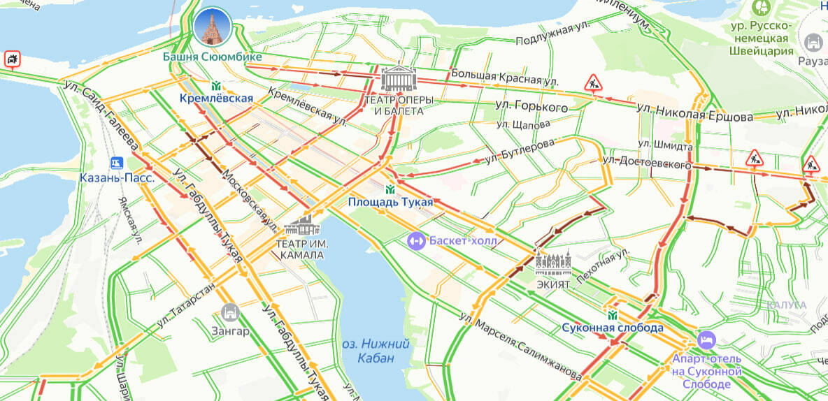 Основные пробки — в центре, но есть и в спальных районах. Затруднено движение на улицах Пушкина, Татарстан, Тихомирнова, Лево-Булачная, Московская, Габдуллы Тукая, Сары Садыковой, Вишневского, Декабристов возле Северного вокзала, Ленской, Мулланура Вахитова, проспекте Ямашева и еще нескольких участках.