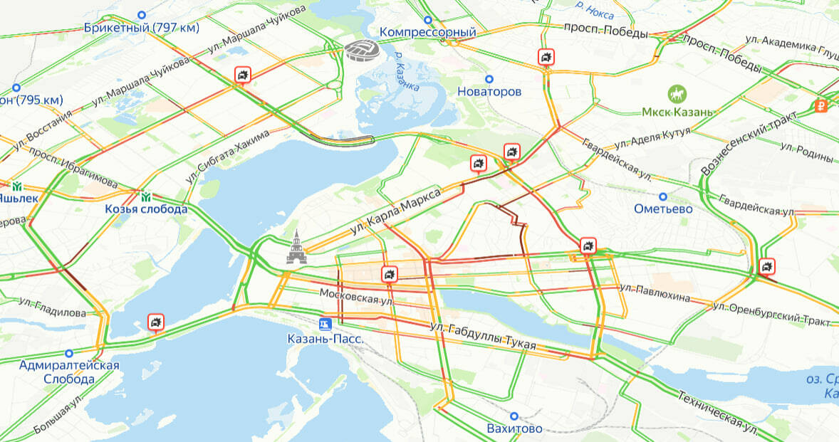 По информации на 17:10, наибольшая загруженность дорог наблюдается в центре столицы Татарстана — улицы Пушкина, Право-Булачная, Вишневского, Николая Ершова. Непростая ситуация для водителей также сложилась на выезде и в Авиастроительном районе.