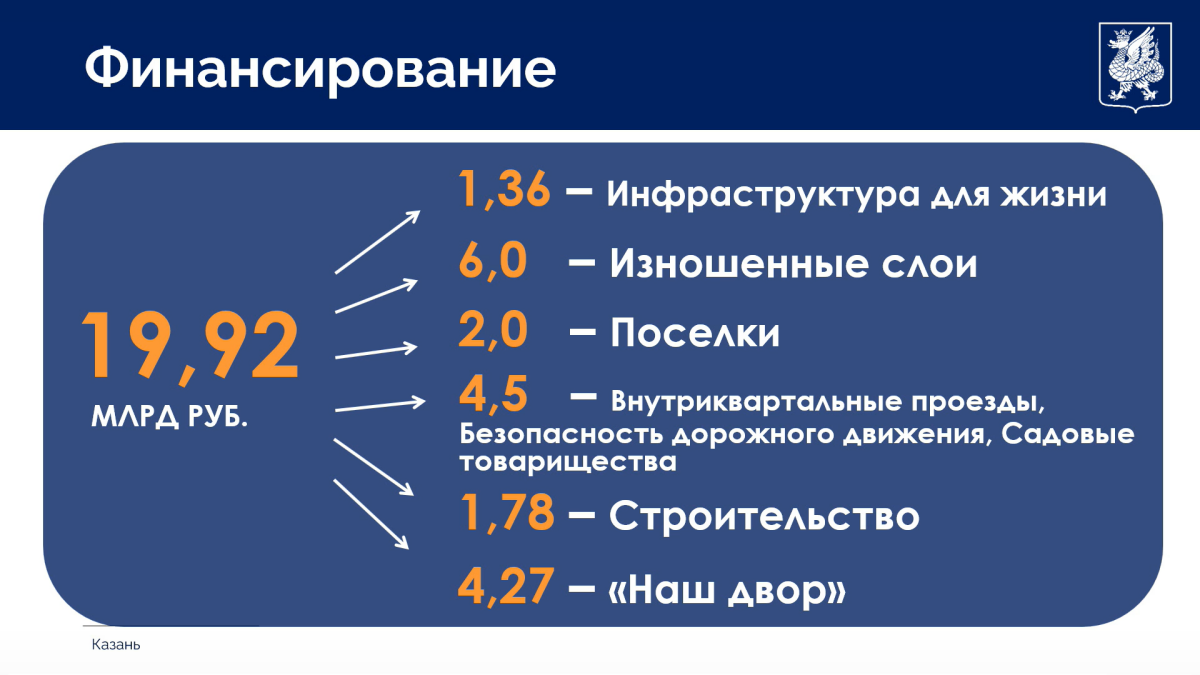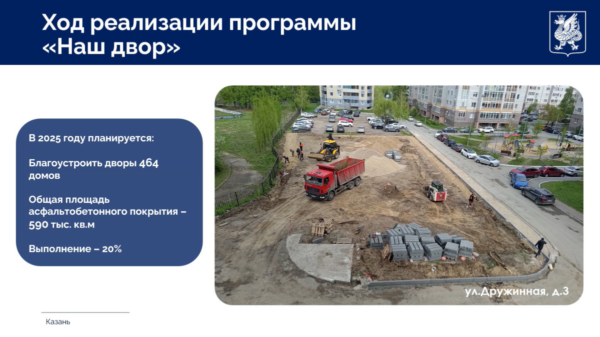 Отдельной строкой в финансировании выделены 4,27 млрд рублей на реализацию программы Раиса РТ Рустама Минниханова «Наш двор», направленной на благоустройство дворовых территорий. Модернизация включает в себя замену покрытий, озеленение, установку освещения, спортивных и детских площадок.