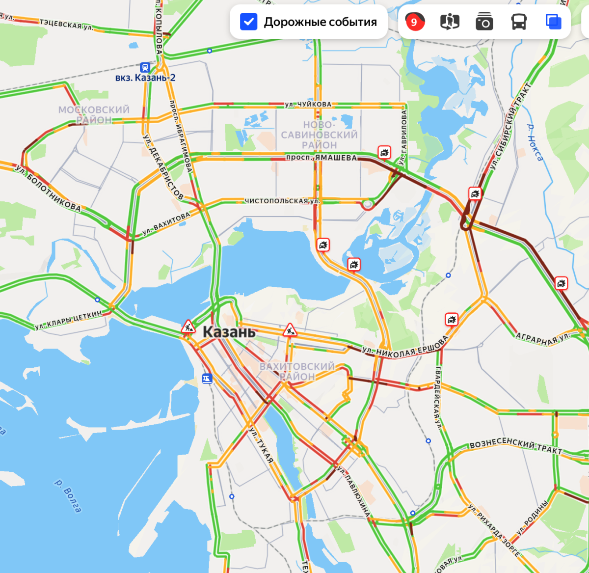 Вечером в среду на дорогах Казани образовались 9‑балльные пробки, сообщает сервис «Яндекс Карты».