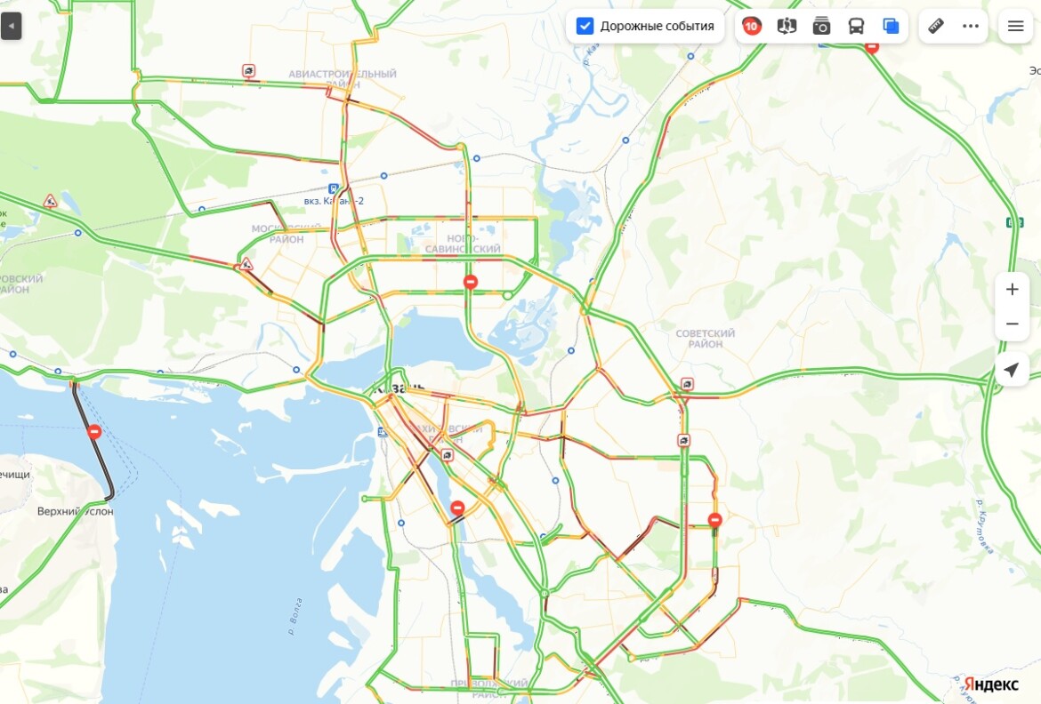Согласно информации сервиса Яндекс.Пробки, дорожные заторы в Казани оцениваются в десять баллов.
