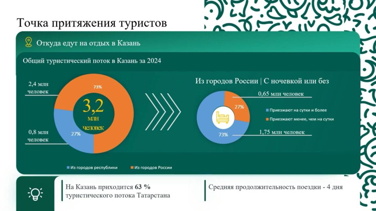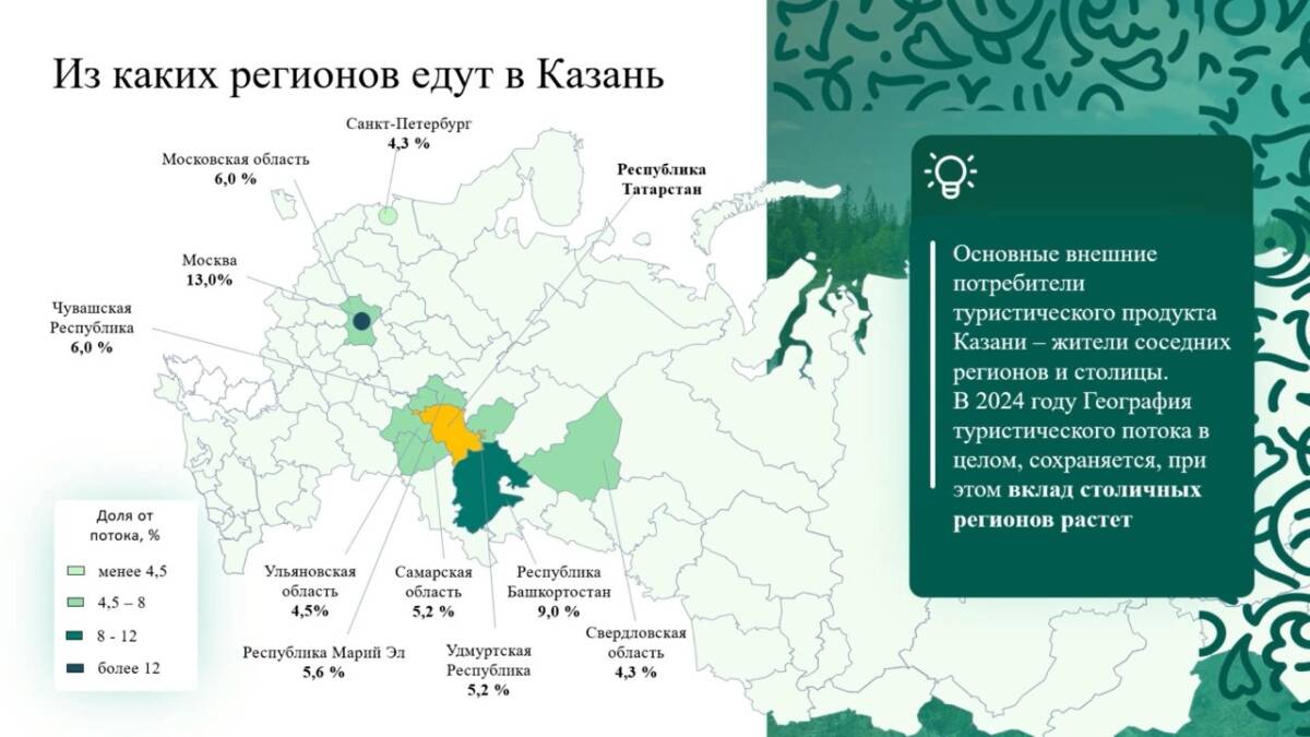 В структуре туристического потока около 74% приходится на туристов из регионов России. Их численность составила порядка 2,4 млн человек. Чаще всего в Казань едут из Москвы – 13%, Башкортостана – 9%, Московской области и Чувашии – по 6%.