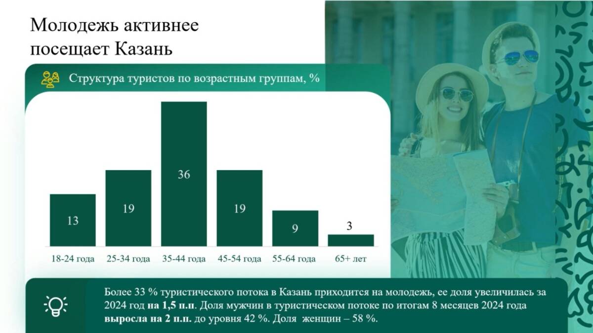 Санникова также отметила, что чаще всего гостями города становятся женщины, их доля от общего количества туристов составляет 58%, мужчин, соответственно, 42%. Средний возраст посещающих Казань по итогам первых 8 месяцев составил 40 лет. Средняя длительность поездки – 4 дня.