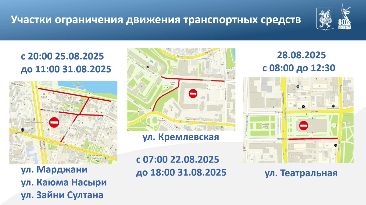 С 20:00 25 августа до 11:00 31 августа – на улицах Шигабутдина Марджани, Каюма Насыри и Зайни Султана;