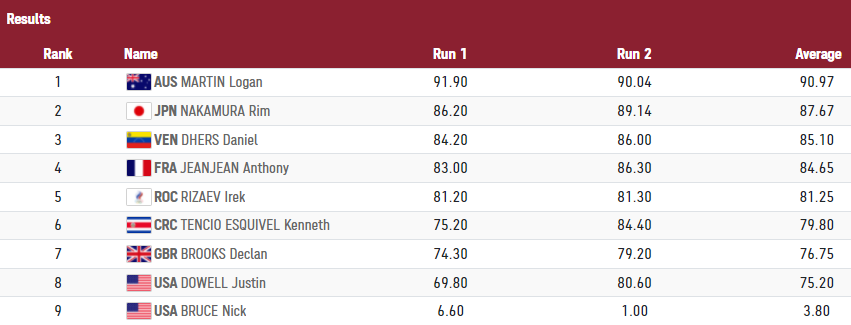 23-летний спортсмен получил оценку 81,20 в первой попытке и 81,30 – во второй. Средний балл – 81,25 и место ровно посередине по итогам квалификации из 9-ти участников в мужском турнире. Лучший результат показал Логан Мартин из Австралии – 90, 97.