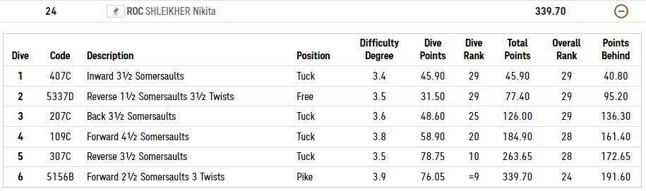 Казанский спортсмен Никита Шлейхер занял лишь 24-е место (из 29-ти участников) в квалификационном турнире по прыжкам в воду с 3-метрового трамплина, который прошел сегодня на Олимпиаде в Токио.