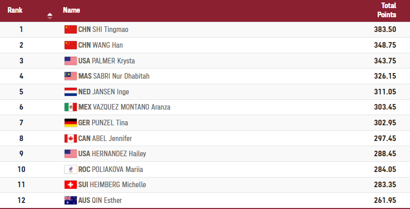 Два первых места заняли представительницы Китая, бронза у спорстменки из США.