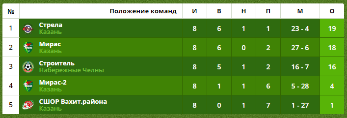 По итогам 8-ми сыгранных туров «Стрела» (тренирует команду Иркен Сафиуллин) набрала 19 очков и на один балл опередила команду «Мирас» (тренер Елена Дремова).