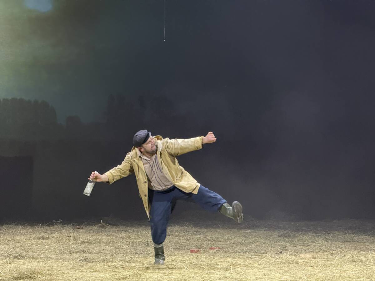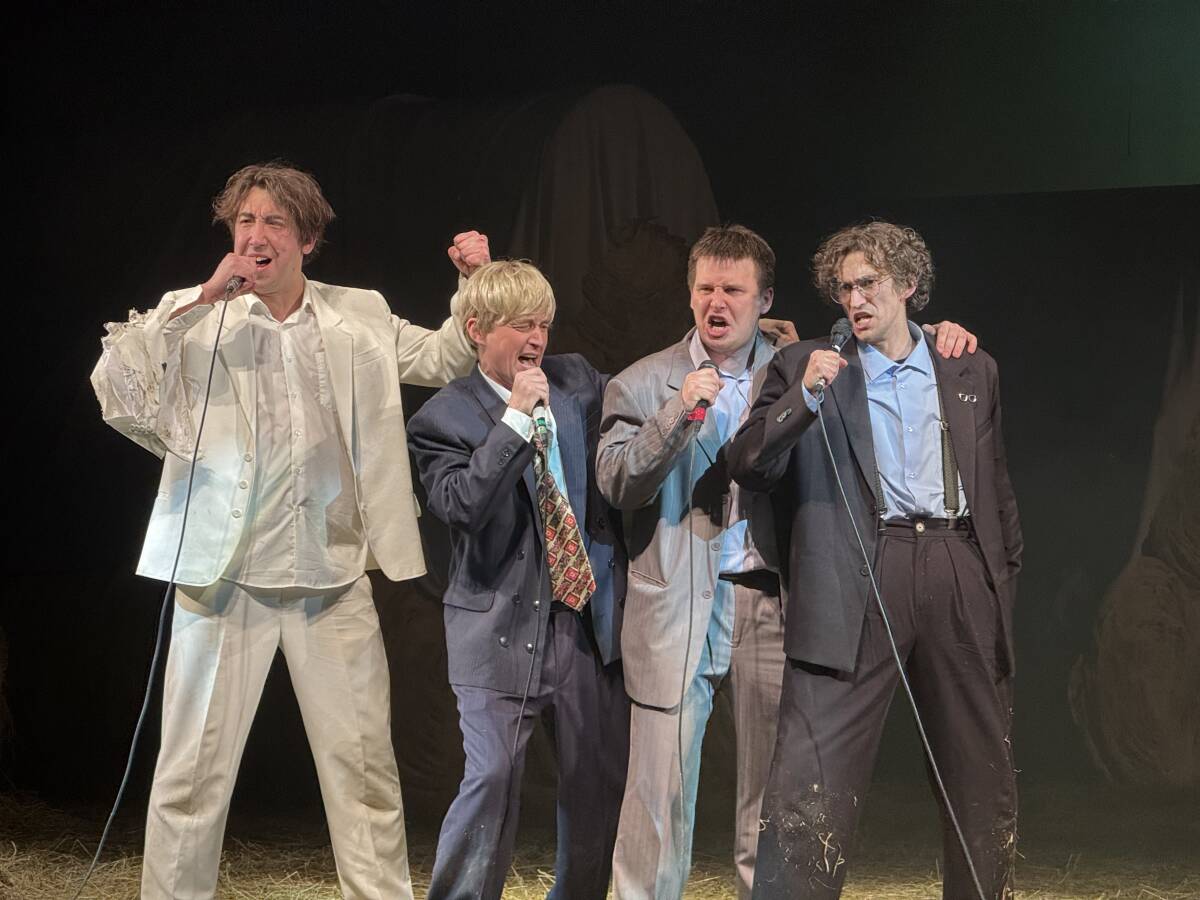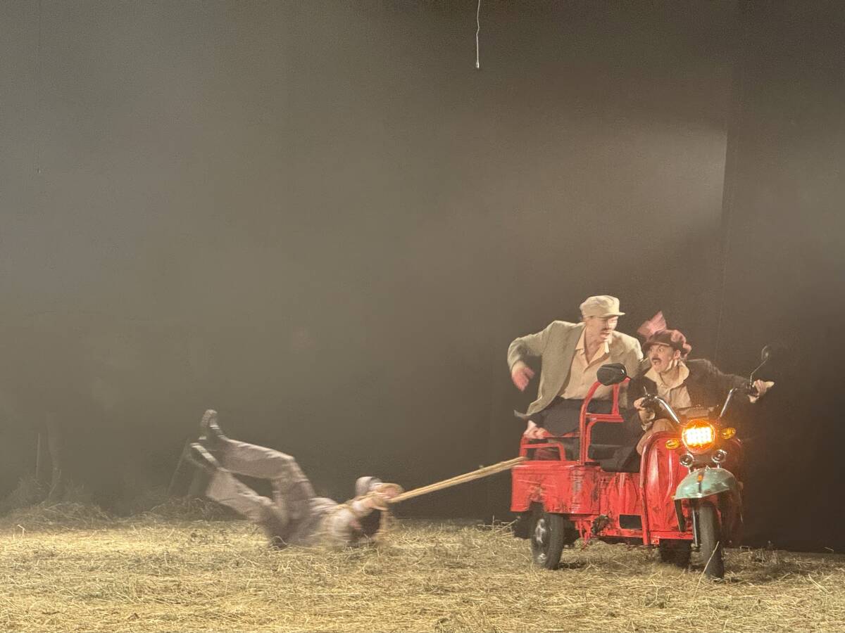Сюжет ремейка «Казанских парней» развернется на выжженном летним зноем поле. Желтый печән («не путать с соломой» – мем из спектакля) в аккуратных тюках, небольшая речушка вдоль оркестровой ямы, красный мотоцикл и много чего еще. Декорации в постановке Айдара Заббарова невероятные (художник-постановщик Булат Ибрагимов), им есть чем удивить, и запах свежего сена скоро погружает зрителя в пасторальную атмосферу.